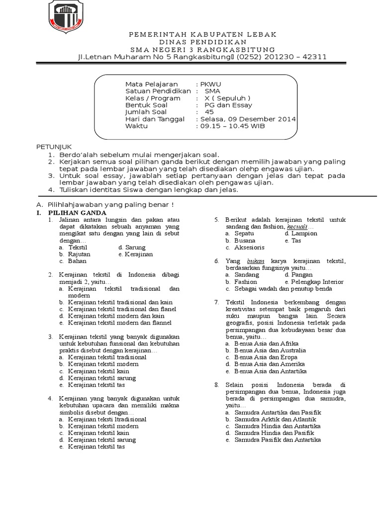 Soal essay dan jawaban tentang kerajinan tekstil. We did not find results for: Maybe you would like to learn more about one of these? Check spelling or type a new query.