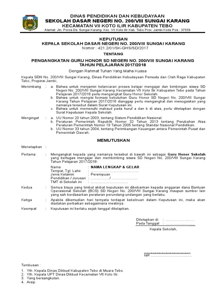 Contoh Sk Guru Honorer 2019 : Persyaratan Pengajuan Sk Bupati Bagi Guru Honorer Asnri : contoh sk guru honorer terbaru sd smp smasmk tahun 20202021 merupakan sebuah surat keputusan yang diberikan oleh kepala sekolah untuk memenuhi arsip administrasi atau sebagai bukti bagi gtt honor yang akan mengabdi di sekolah tersebutnah bagi anda yang ingin membuat sk namun tidak tahu caranya disini admin kan membagikan conoh sk honorergtt yang dapat anda unduh diakhir postingan ini.